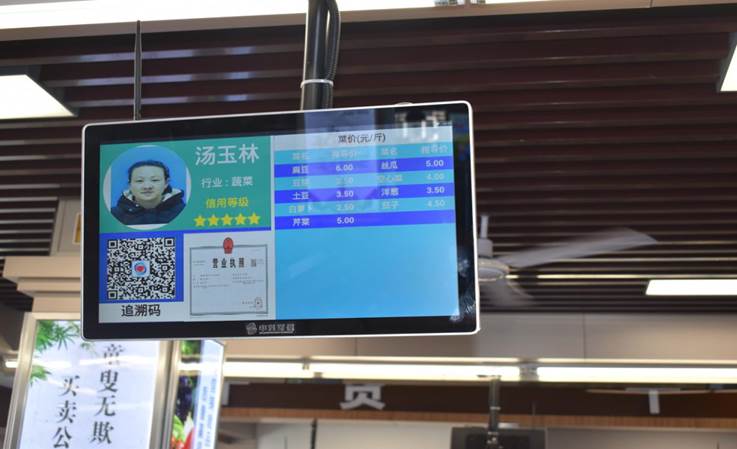安民智慧农超内每个商户设有显示屏,轮流滚动显示该摊位菜品价格,居民只要扫一扫上面的二维码,不仅可以查看菜品的来源和检验结果,也可以快捷支付,只要一部手机,居民就能“横扫”整个市场。