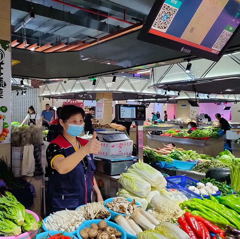 改造完成后的张家港市东菜场的智慧农贸系统为买菜带来了很大的方便,进门测量体温,看看信息大屏就知道当天的菜品抽样检测结果,抬抬头就知道哪个区域所售产品。到了摊位看看商户信息屏,一目了然营业制造、商品价格等信息,选购好所需菜品后,支持多种支付方式,小票还能扫码溯源。产品丰富、质量有保证,市场环境干净整洁,张家港东菜场在最大程度满足周边居民的菜篮子需求,为消费者提供安心,放心,便捷的购物环境和体验。