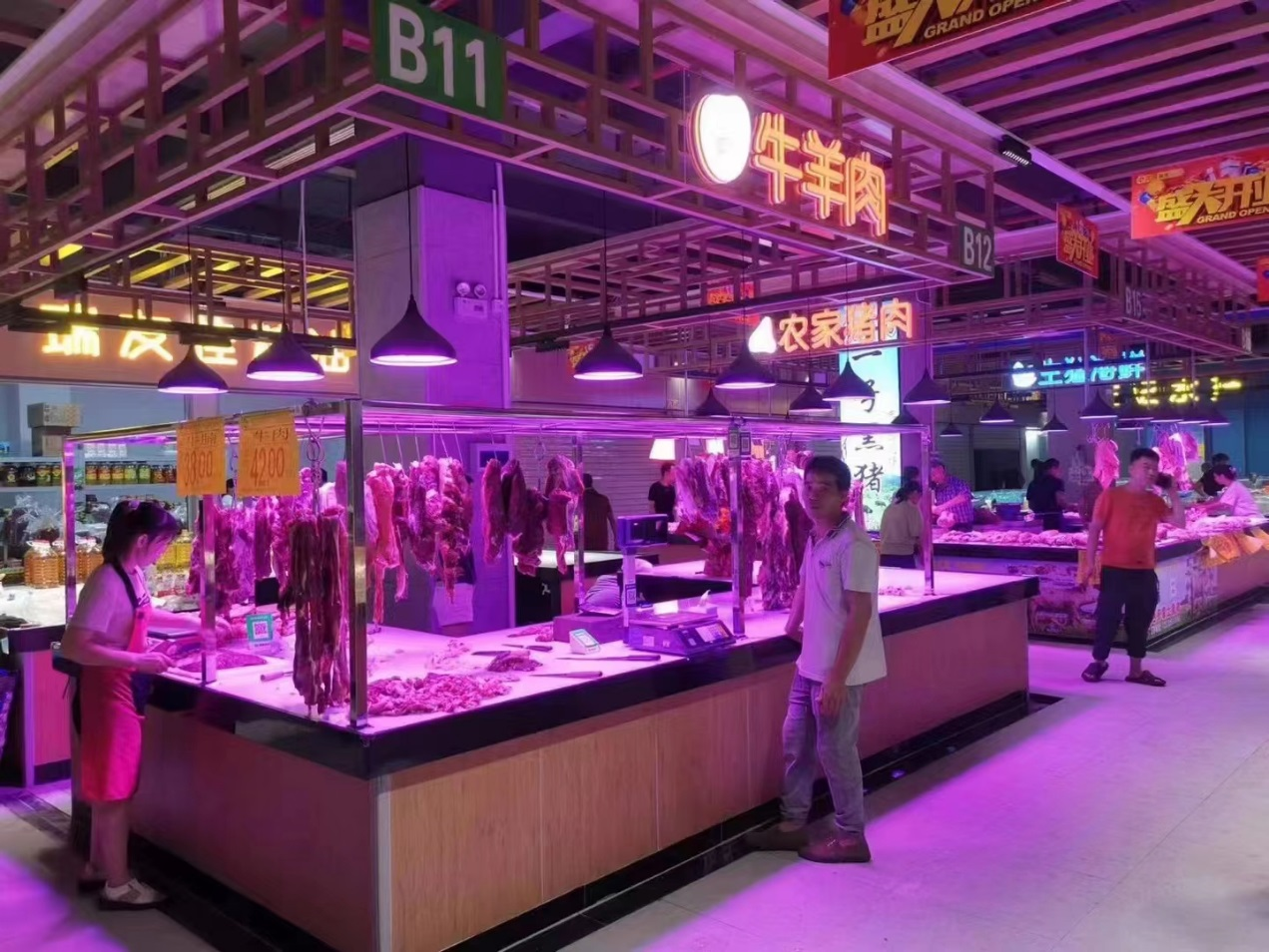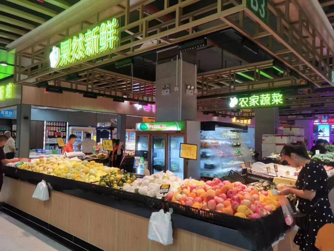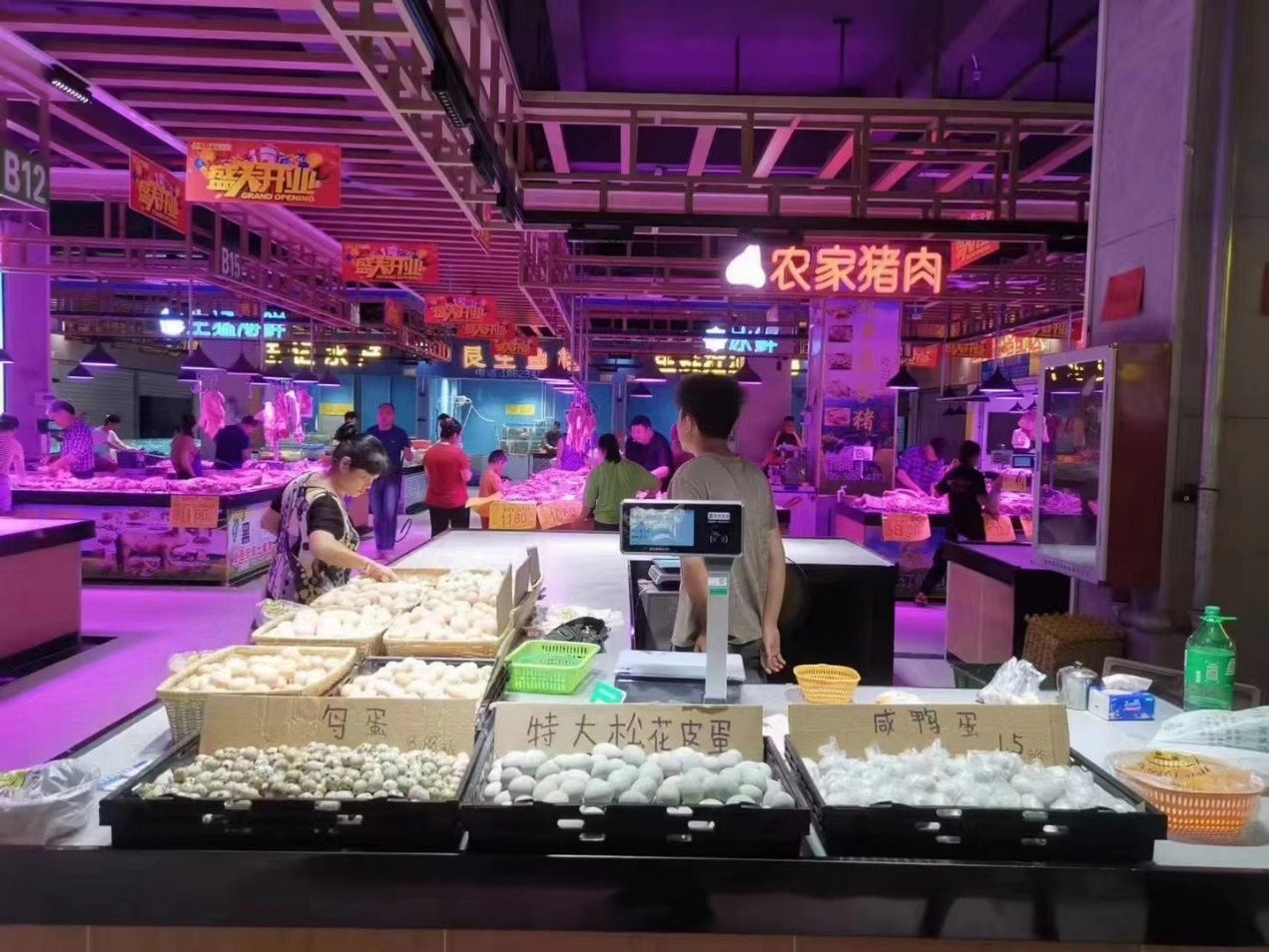 位于深圳宝安石龙社区龙贸鲜生便民市集,有了自己的专属颜色,宽敞整洁的环境、防滑耐脏的地面,同时在引入了智慧化、数字化升级改造后,实现了小菜场改善大民生的消费新体验。