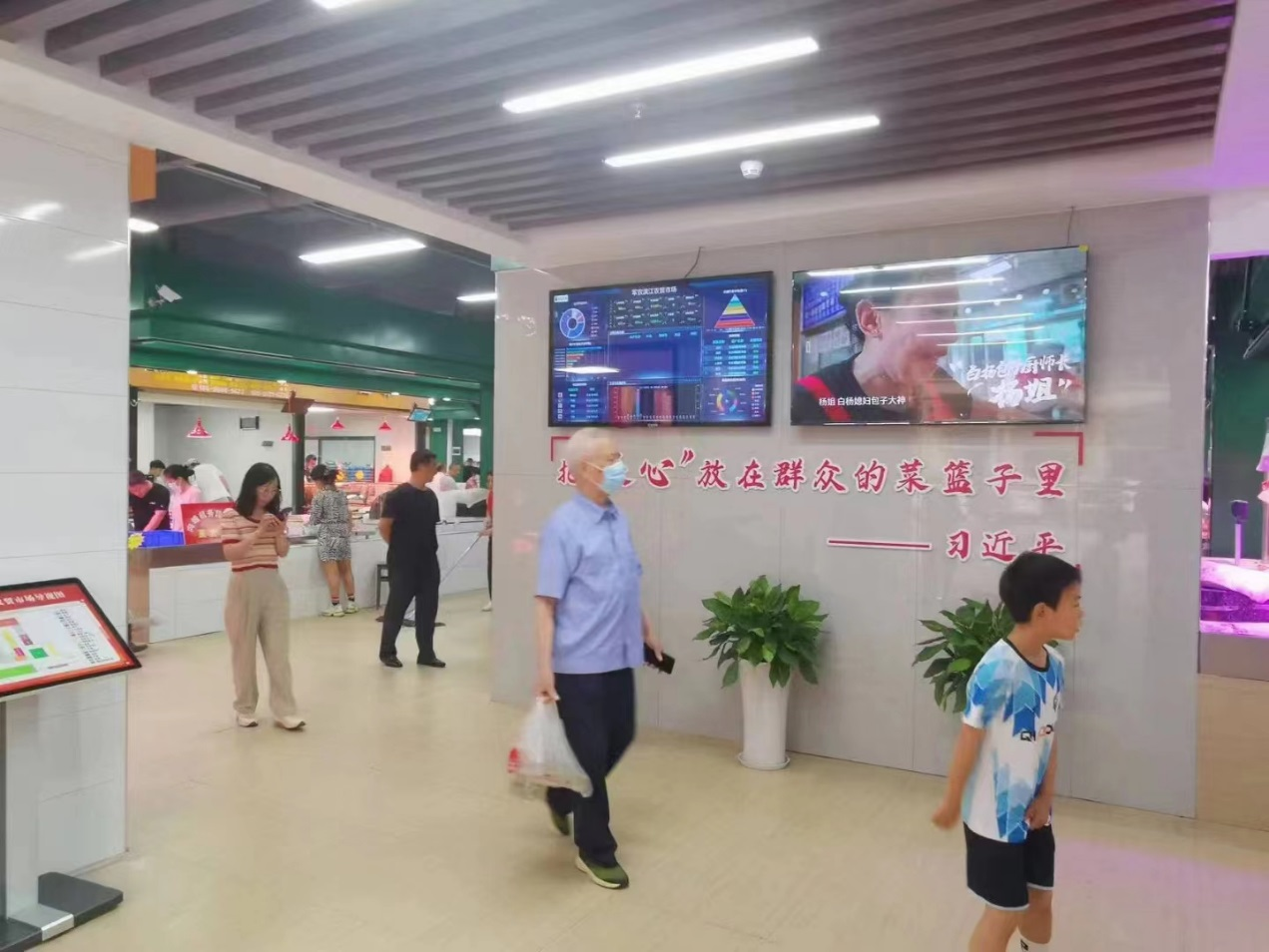 军农滨江农贸市场位于南昌市红谷滩区三百山路万达旅游城,改造后的智慧菜市场内都配备了许多智能化终端设备,其中就包括价格展示的设备,比如统一的溯源电子秤、查询机,大数据展示屏,商户公示屏等,顾客走进市场里都可以看到滚动的菜价,一目了然,而且每个摊位上也都会标明每个菜品的单价,真正实现价格透明化。