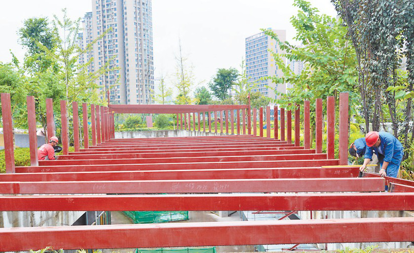 工人修建玻璃采光棚。