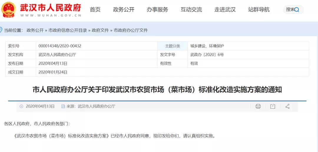 楚天都市报微信公号4月13日消息,在做好新型冠状病毒感染的肺炎疫情防控时期,武汉市范围内严禁农贸市场(菜市场)销售和宰杀活禽。今日,武汉市农贸市场(菜市场)标准化改造实施方案在武汉市政府官网上公布。