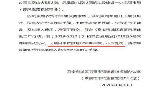 记者注意到,2020年8月,泰安城区农贸市场建设指挥部曾向泰安市自然资源和规划局下达通知,明确指出:凤凰路农贸市场建设符合相关文件精神及规定,现项目单位按规定完善手续,不应处罚。但这一通知并没有被泰安市自然资源和规划局采纳。
