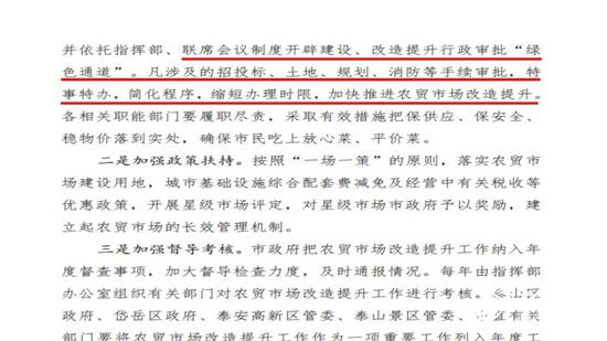 但在《泰安市城区农贸市场建设二年行动计划》保障措施中提到,市政府将改造提升工作纳入民生实事工程,开辟审批“绿色通道”,凡涉及的土地、规划等手续审批,特事特办,简化程序,缩短办理时限。