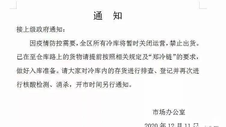 接上级政府通知,郑州市场办公室11日发布最新通知:自12月12日起,全区所有冷库将暂时关闭运营,禁止出货。已在至仓库路上的货物请提前按照相关规定及“郑冷链”的要求,做好入库准备。请大家对冷库内的存货进行排查、登记并再次进行核酸检测、消杀,开市时间另行通知!