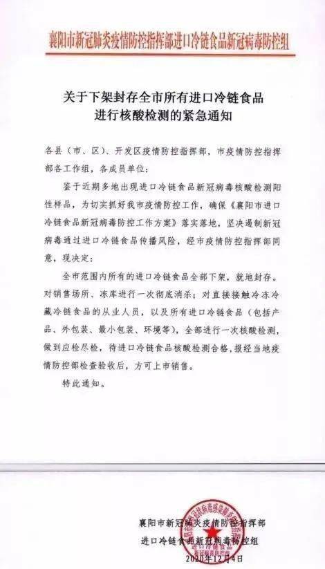12月4日,襄阳市新冠肺炎疫情防控指挥部进口冷链食品新冠病毒防控组发布《关于下架封存全市所有进口冷链食品进行核酸检测的紧急通知》。