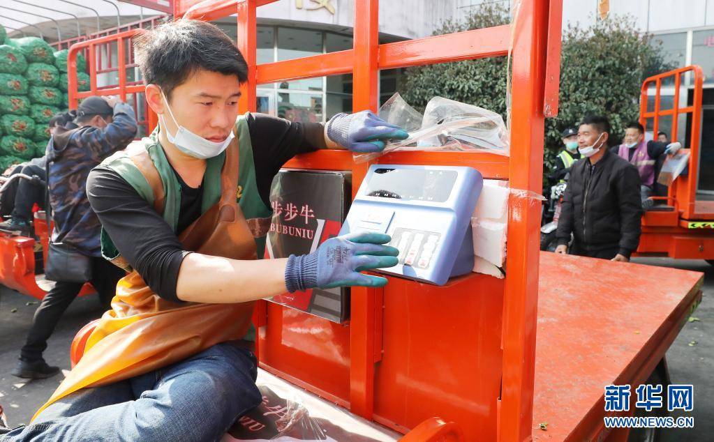 3月25日,在上海江桥批发市场内,市场技术人员在新款短驳车旁操作演示移动结算设备。