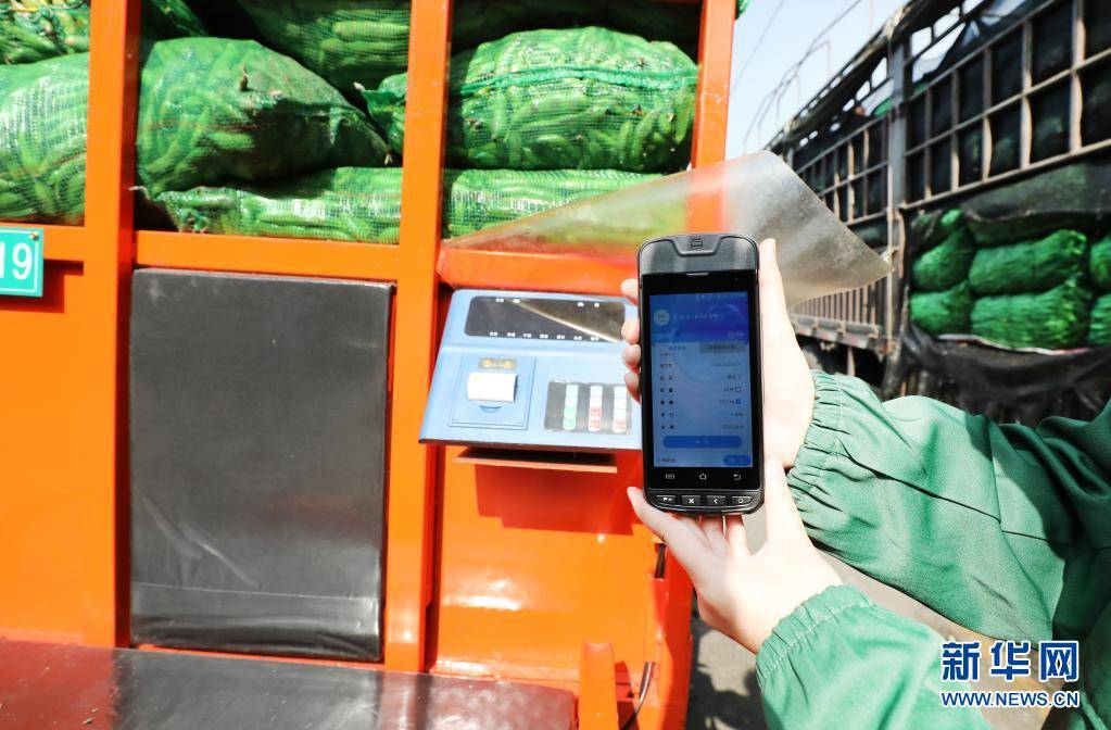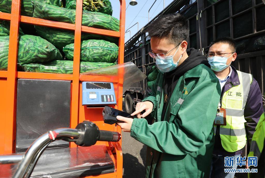 3月25日,在上海江桥批发市场内,市场技术人员展示在移动结算设备屏幕上显示的货物结算信息。