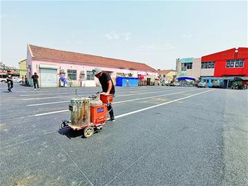 即墨区通济街道盛兴社区正组织人员在新铺的沥青地面上划摊位线。