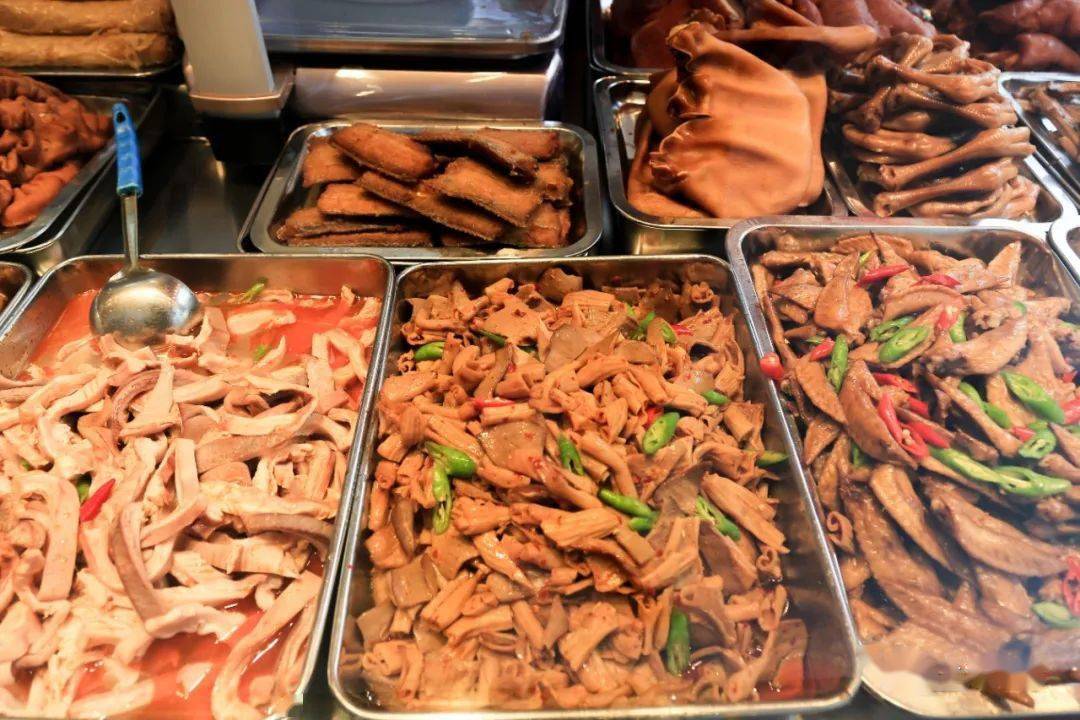 在菜场沿街商铺,聚集了多家老牌熟食店,酱鸭、烧鹅、糖藕、带鱼……光看看就能激发食欲。如果不想买菜做饭,可以直接打包买回家。