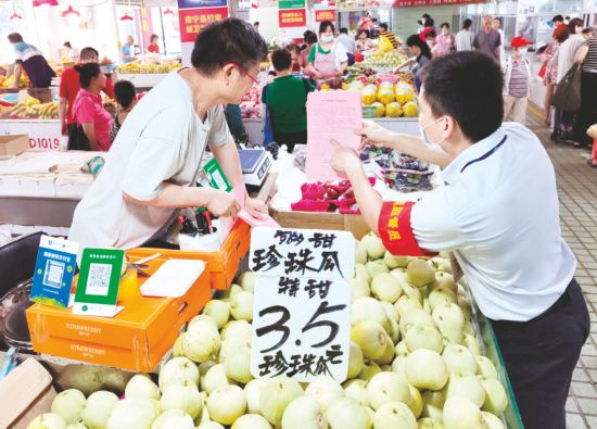 软件进行了升级,硬件也不能落后。南宁市市场监督管理局积极联动商务部门开展农贸市场农产品自产自销区示范点建设工作,对市场内农产品自产自销区硬件设施进行升级改造,解决部分农贸市场瓜果蔬菜农产品自产自销区基础硬件设施缺失等现象。截至目前,各城区(开发区)市场方共投入24.1万元,打造了10个农产品自产自销区建设试点市场。针对部分市场活禽区亮照不规范、检验检疫证不能及时出示等问题,西乡塘区市场监管局率先制作一批“活禽经营公示牌”,并指导经营户将公示牌张贴上墙,统一公示营业执照、检验检疫证及清洗消毒记录、活禽消毒及“111制度”,进一步提升市场建设规范化程度。