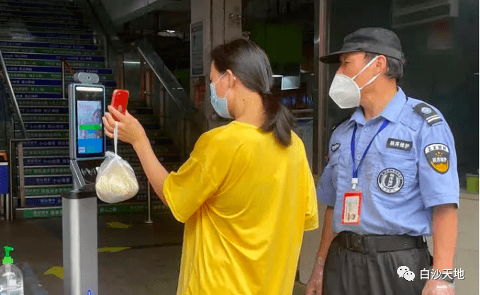 经过长长的通道,里面还有两道门岗,分发手套、扫码登记。市民也都能配合理解。
