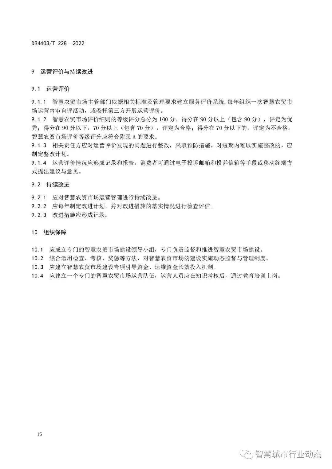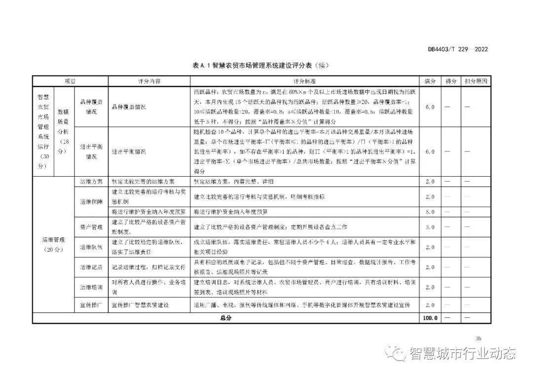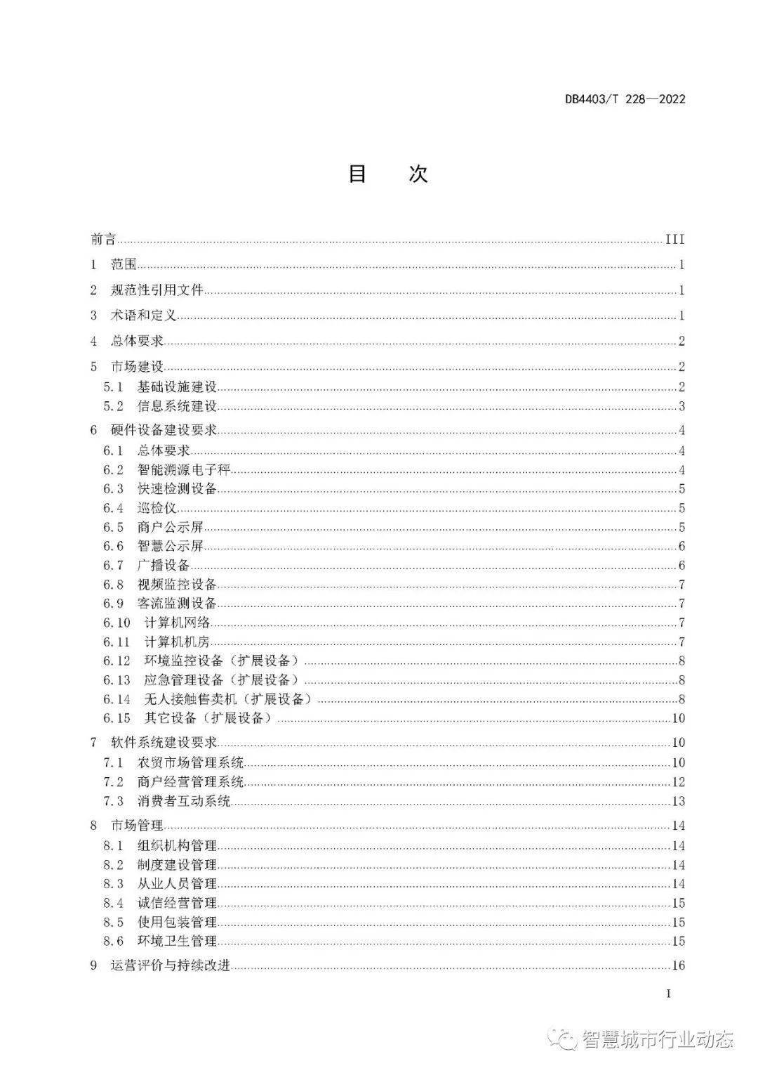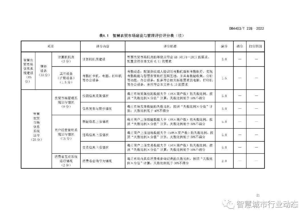《智慧农贸市场建设与管理规范》规定了智慧农贸市场建设与管理的 总体要求、市场建设、硬件设备建设要求、软件系统建设要求、市场管理、运营评价与持续改进和组织保障要求。针对智慧农贸市场建设与管理情况,从系统建设、运行和组织管理 3 大项 58 小项提供了评价依据。