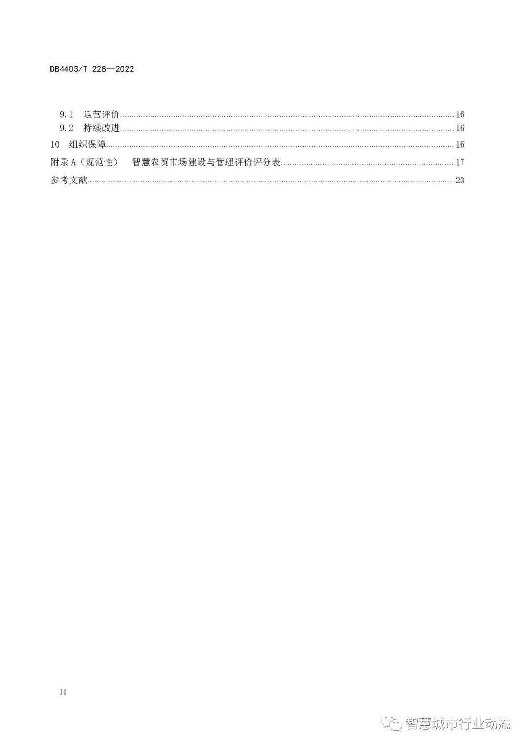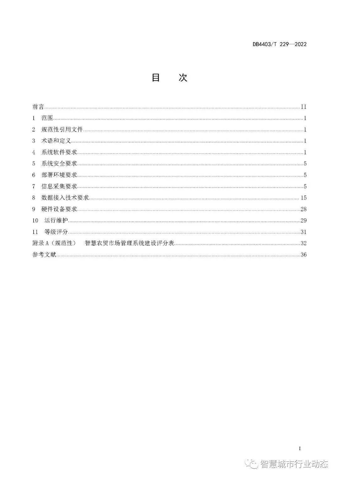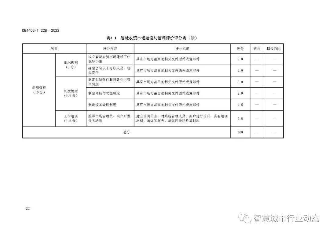 《智慧农贸市场建设与管理规范》规定了智慧农贸市场建设与管理的 总体要求、市场建设、硬件设备建设要求、软件系统建设要求、市场管理、运营评价与持续改进和组织保障要求。针对智慧农贸市场建设与管理情况,从系统建设、运行和组织管理 3 大项 58 小项提供了评价依据。