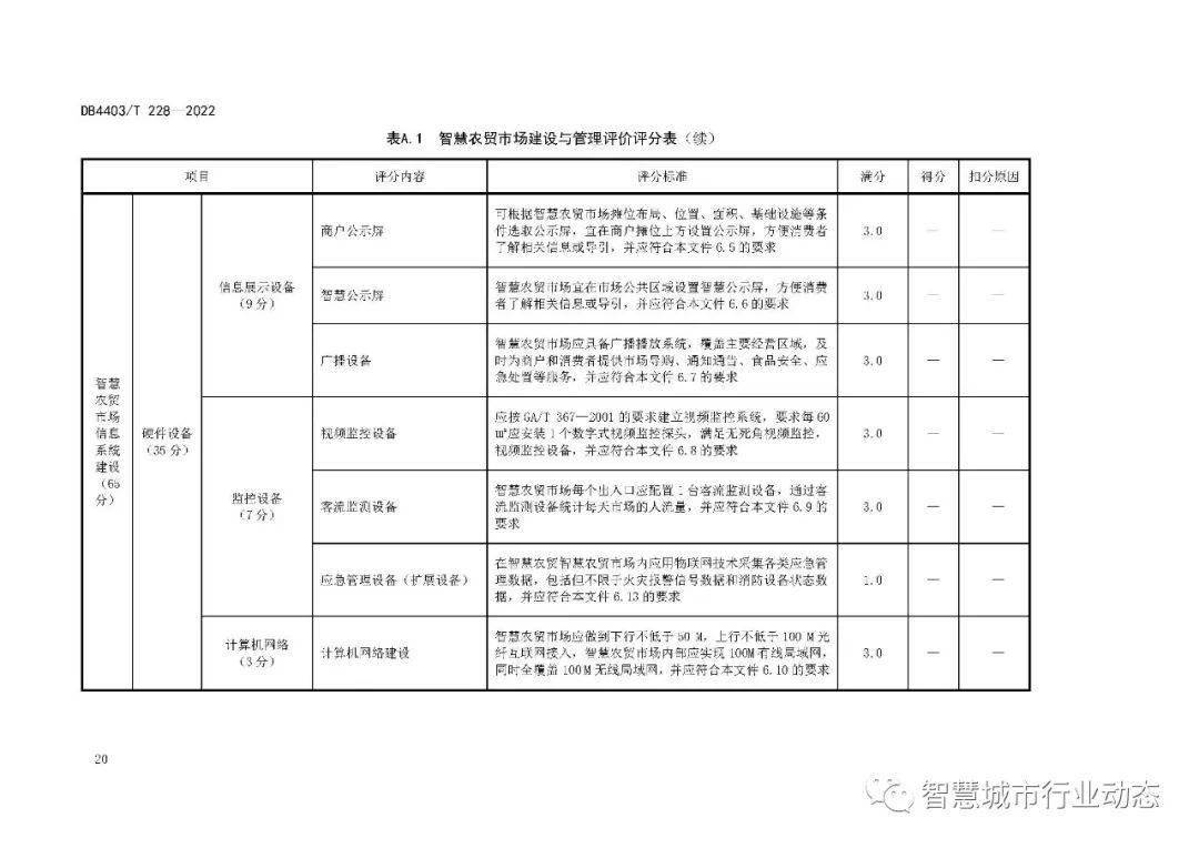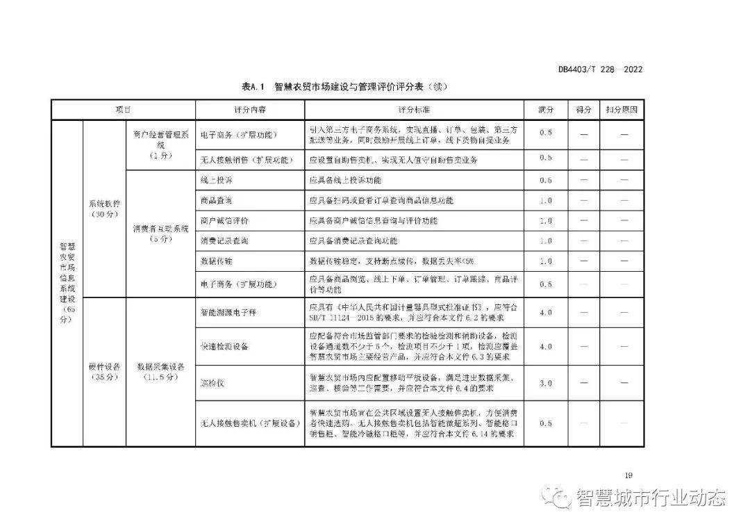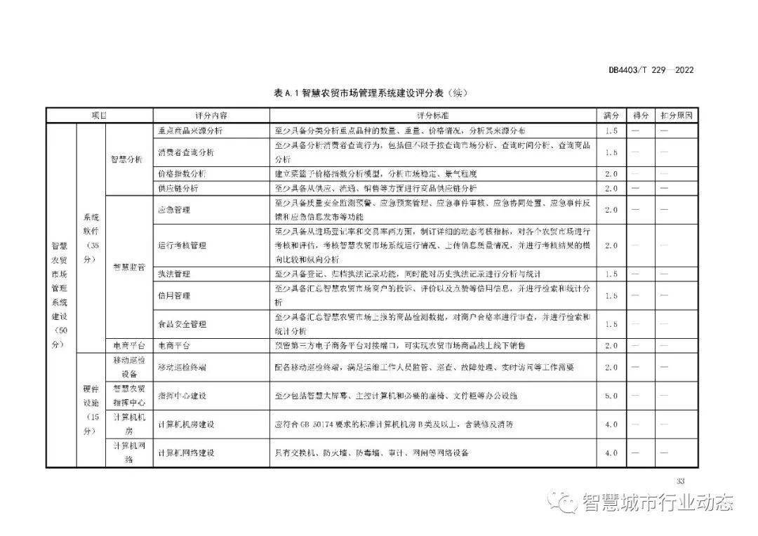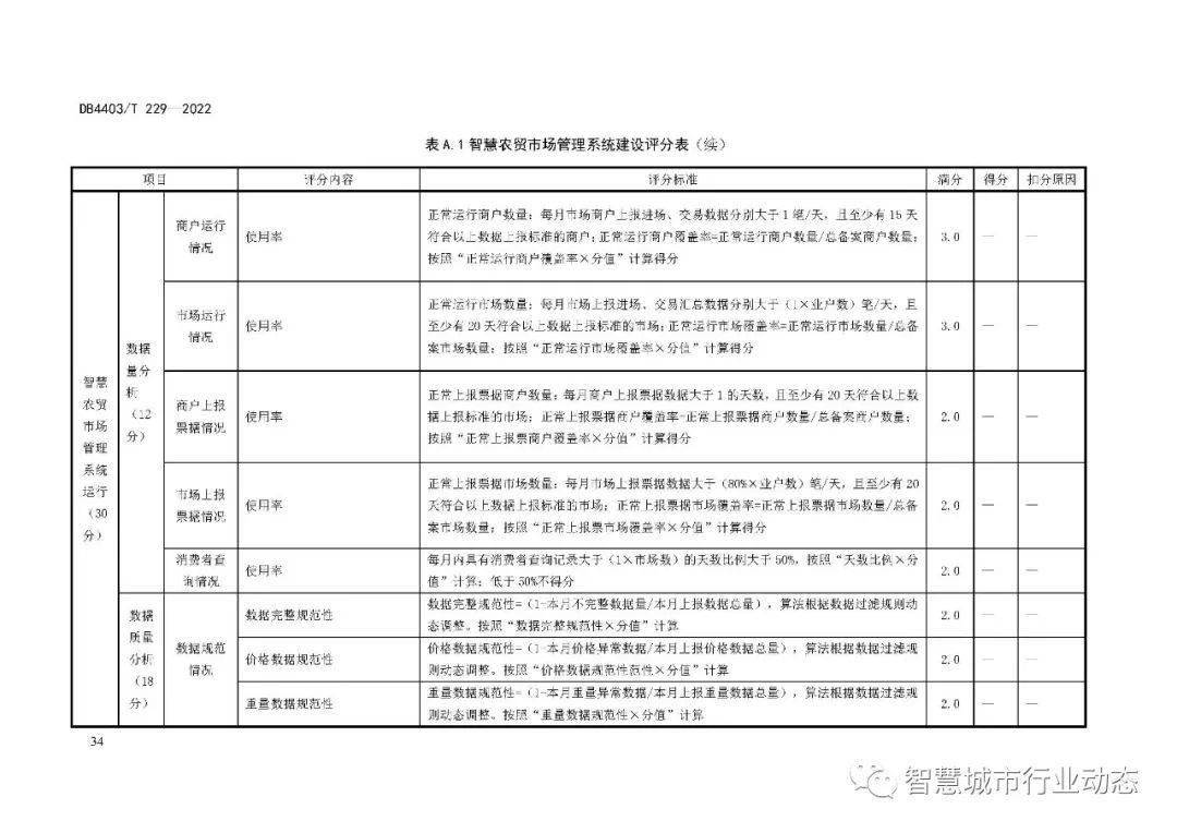 《智慧农贸市场管理系统建设规范》规定了 市区两级智慧农贸市场管理系统建设的系统软件要求、系统安全要求、部署环境要求、硬件设备要求、运行维护和等级评分要求。针对市区两级智慧农贸市场管理系统建设情况,从系统建设、系统运行、运维管理 3 大项 44 小项提供了评价依据。