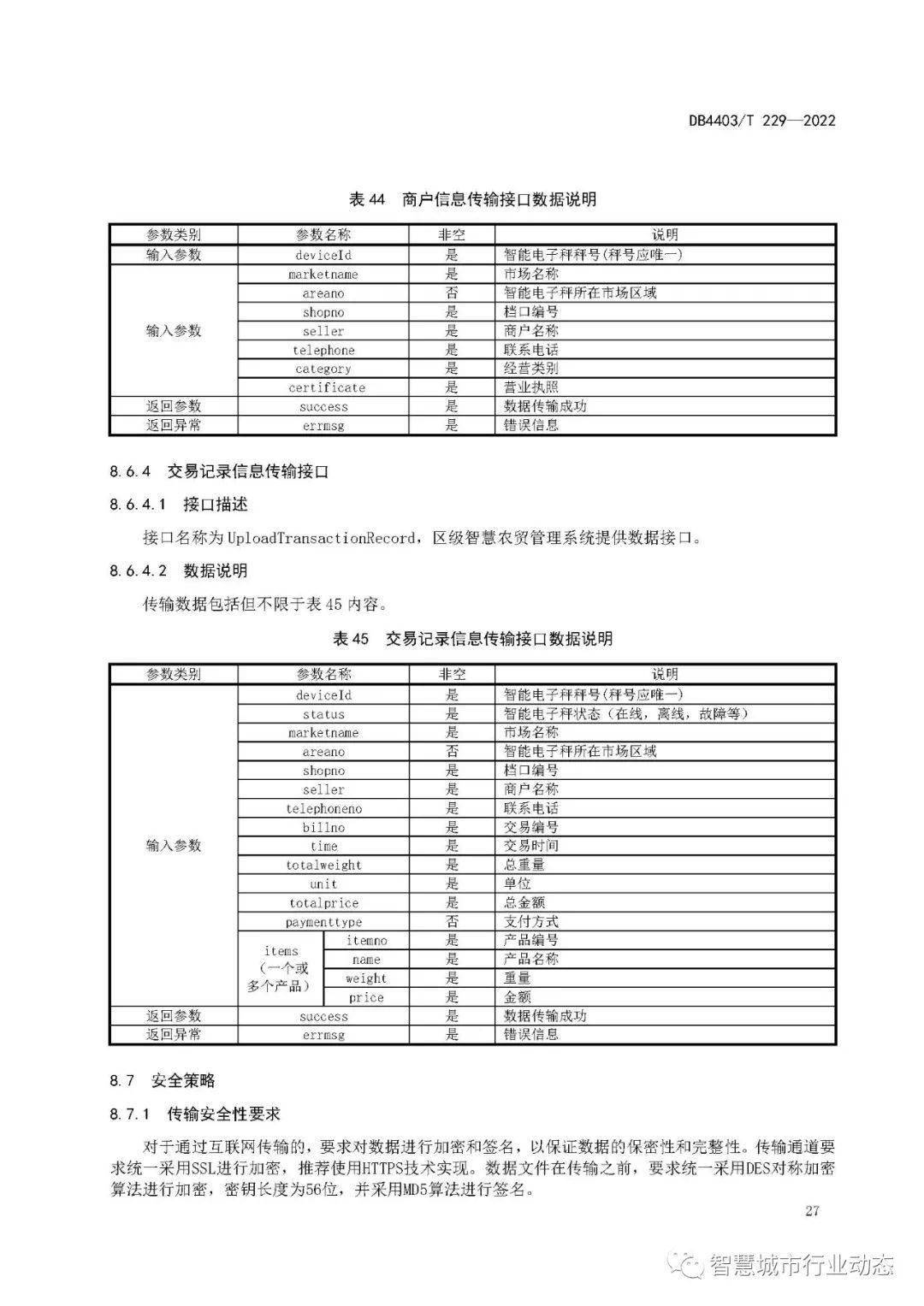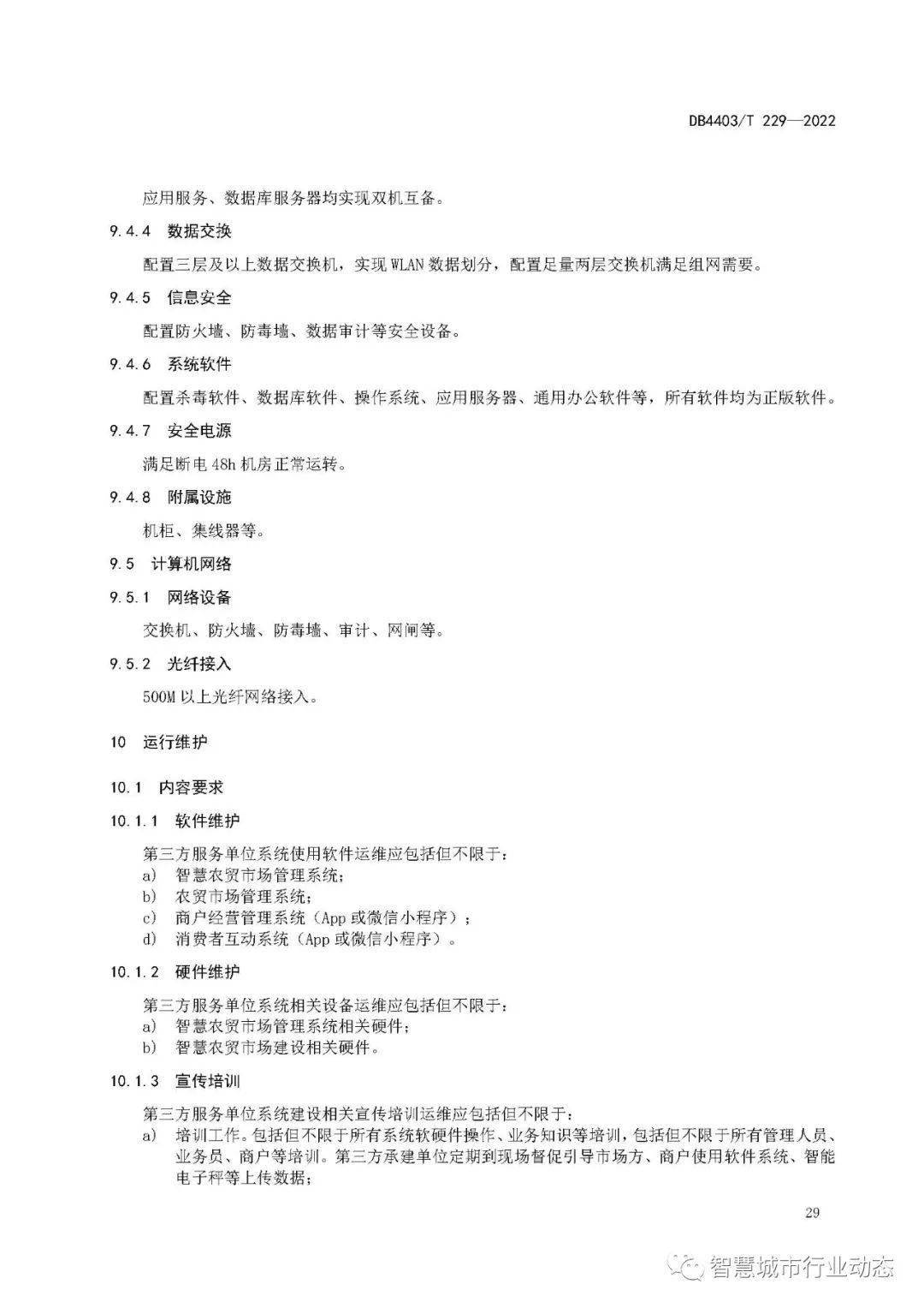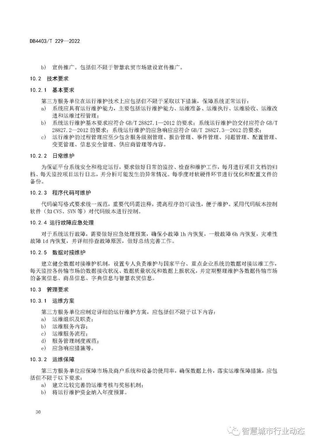 《智慧农贸市场管理系统建设规范》规定了 市区两级智慧农贸市场管理系统建设的系统软件要求、系统安全要求、部署环境要求、硬件设备要求、运行维护和等级评分要求。针对市区两级智慧农贸市场管理系统建设情况,从系统建设、系统运行、运维管理 3 大项 44 小项提供了评价依据。