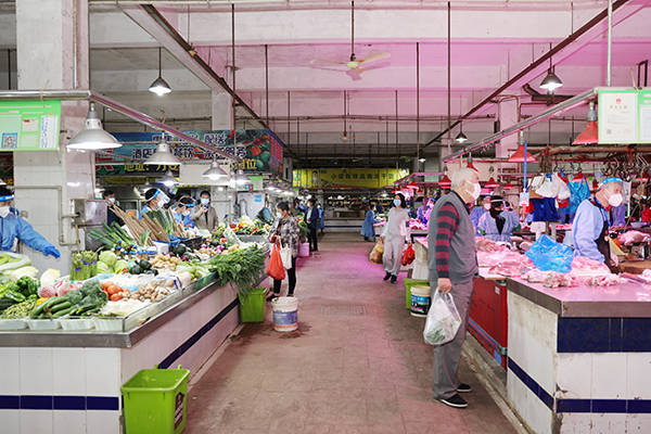 市场内,按照市场总占地面积等相关标准,合理设定了最大限流人数为500人,同一时间段内顾客不超过150人,同时,安排专员不间断巡场,实时提醒顾客购物时保持安全距离,采买完毕尽快离场。