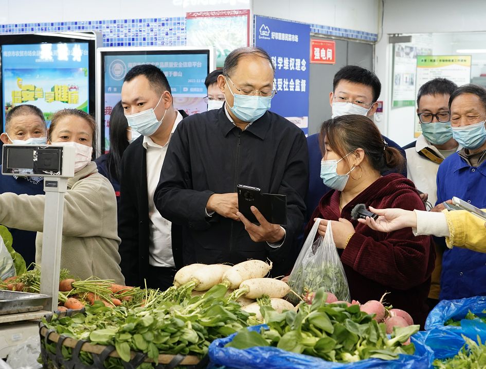 11月2日,南京市市场监管局党组书记、局长时新峰一行来到建邺区好邻里惠民菜市场,与现场市民一起体验“电子秤计量信息管理系统”。