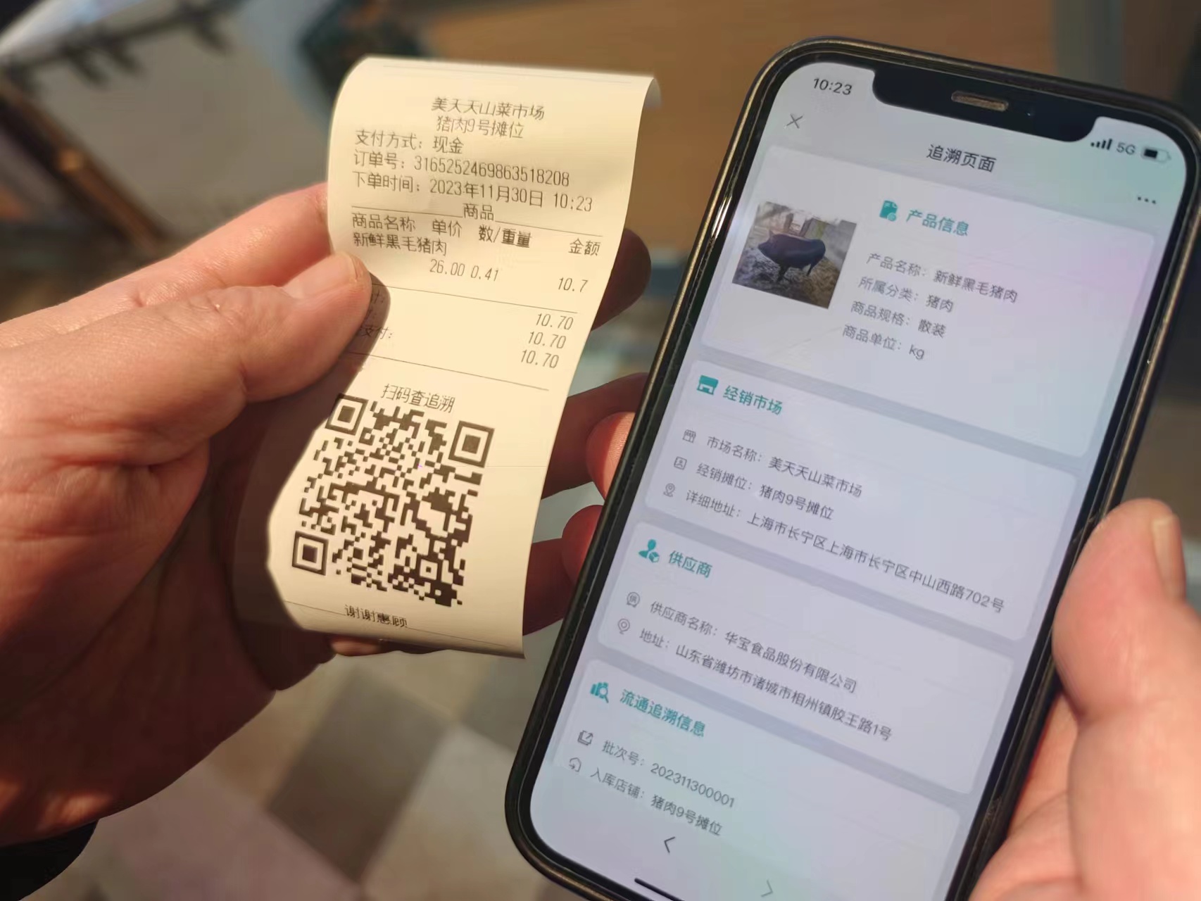 小票上有二维码,扫一扫可以实现溯源。劳动报记者陆燕婷 摄影