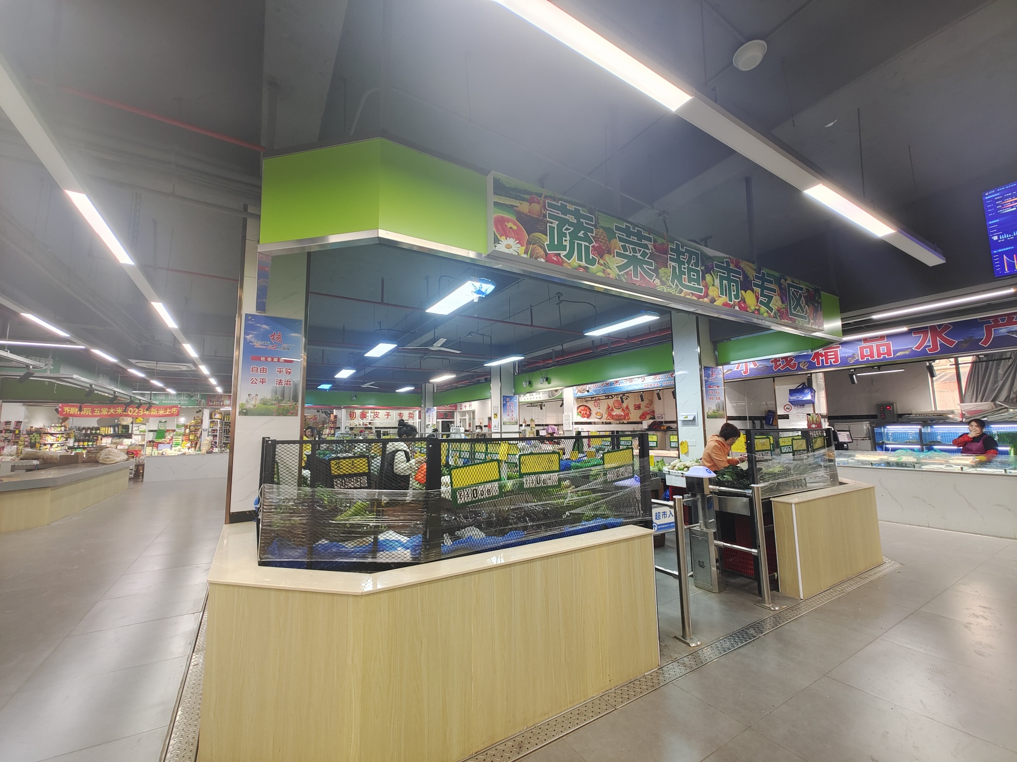 “从外观到内在,只是通过数据化整合的方法,让传统菜场更干净、简洁、清晰、明了。”大宁集团金贸公司副总经理钱万华向记者讲述了旗下14家标准化菜场的升级理念。“在区属国企大宁集团的支持下,惠民与创新共进,各菜场数智化元素上新,在硬件上加入智慧化运行管理系统、智能大屏、智能AI识别电子秤、客流监测与行为识别检测,实现整体数字化改造。”