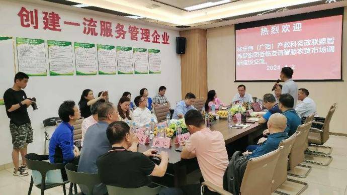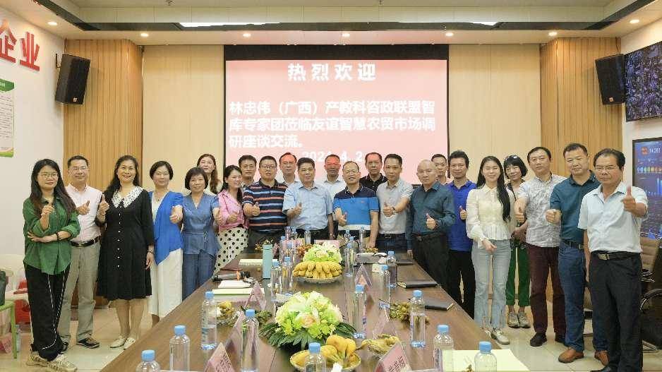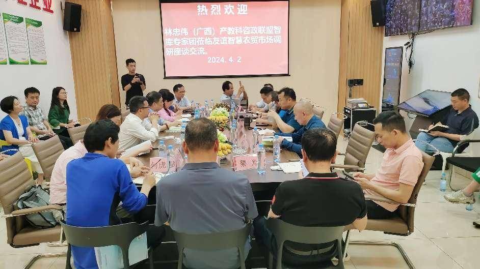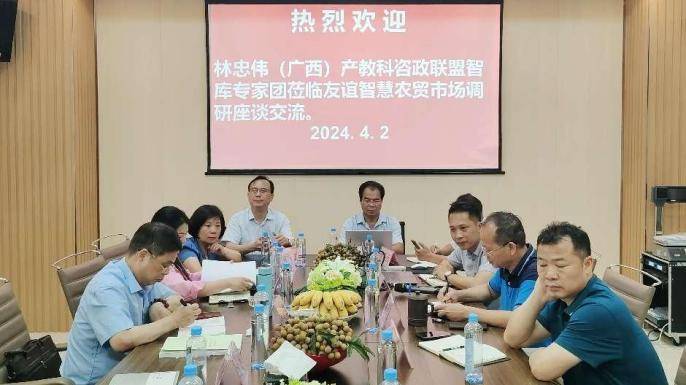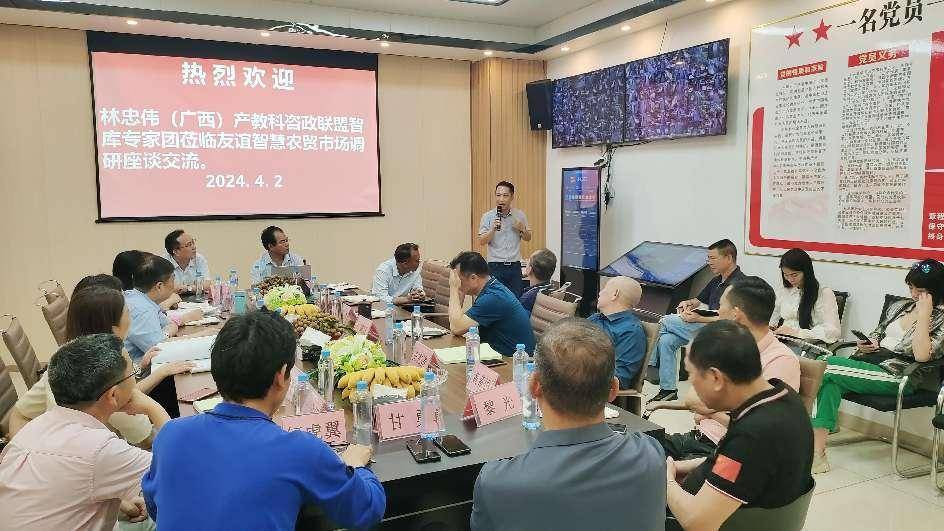 ——林忠伟咨政工作室智库专家团赴友谊智慧农贸市场调研纪实 智如日,春色无边,只因时令;慧如月,鸟语花香,只为季节。春色婆娑,灼灼其华;万物勃发,摇曳生姿,共赴这场春天的创新“智能化+数据化”模式引领实体经济高质量发展的盛宴。 2024年4月2日下午,林忠伟(广西)产教科咨政联盟(六家发起单位,下称咨政联盟)、广西中盟文化经济研究院、致公党广西区委直属第三基层委、致公党广西区委直属第一基层委、致公党广西艺术学院基层委、致公党广西区委直属经济科技基层委组成的智库专家团一行26人来到位于南宁市江南区友谊西二里 12 号友谊智慧农贸市场开展学习交流调研活动。五星级友谊智慧农贸市场董事长杨禄、副总裁马庆毅、总经理林耀毅、市场管理处经理邓明琪等领导层在市场大门热情洋溢、奔放豪情地迎接智库专家团的到来。专家团参观完友谊智慧农贸市场后,随即召开主题为“新时代五星级农贸市场新质生产力发展模式”交流座谈会。专家与企业家碰撞出智慧的火花,对友谊智慧农贸市场现实存在的主要问题与难点、探讨下一步的发展途径与办法,畅所欲言,建言献策。调研活动在友好和谐、情谊浓浓的气氛中达到预期效果,取得圆满成功。 走进五星级:友谊智慧市场开发的模式 创造实体经济发展的奇迹