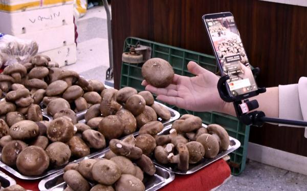11月8日,“车客家园数字化菜市场”中心店工作人员在市场内通过网络直播介绍干果副食。