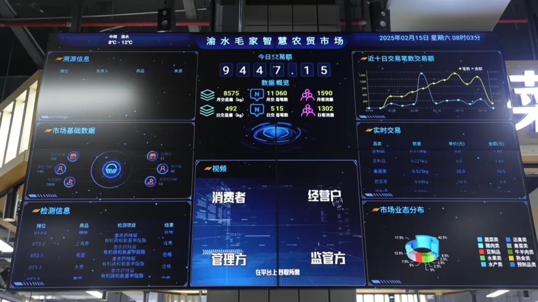 【渝水毛家智慧农贸市场负责人 李春敏:我们这个农贸市场引进了一个智慧农贸系统,通过产品的溯源,包括我们的智慧称,还有我们的显示屏,它可以统计到我们每天的成交量,还有摊位的经营情况,包括摊位产品质量的监督,我们每天会在9点之前,做一个快检,通过智慧屏公式出来。我们根据行业主管单位指导意见,由脏到干净整洁的划分,在市场的东面是干货区,市场的西面是活禽和水产区,这样的话就是干湿分离,一个脏乱分离。】