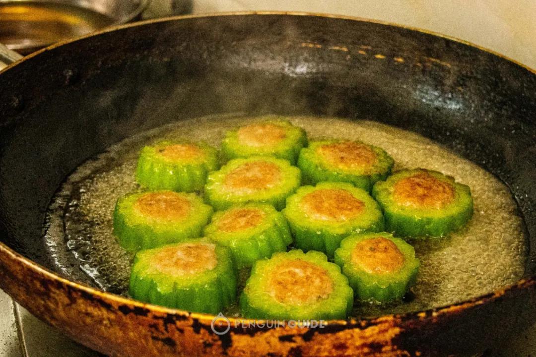 把鲮鱼去骨后仔细挑出刺,捶成起胶的鱼糜,酿进质地脆生的蔬菜里,下宽油煎熟。