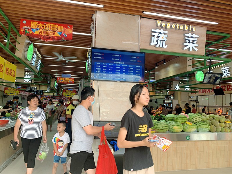 明亮整洁的购物区、智慧化的管理系统……福建泉州三金智慧农贸市场采取全新的空间搭配,加上数字化工具的运用,实现了有“颜值”又有“功能”。电子大屏上滚动着当日人流量、菜品追溯和检测结果等信息;每个摊位配备了可视化中科深信双屏电子秤,价格当场显示并打印购物小票。