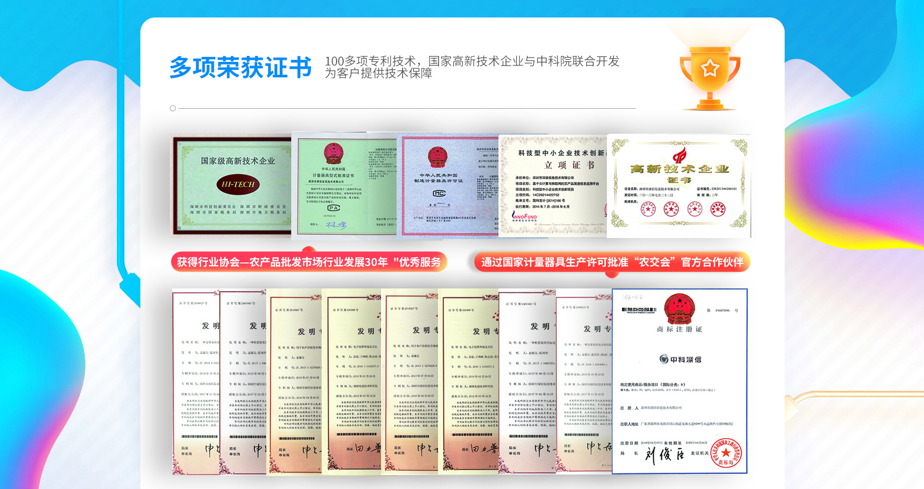中科深信具有完整的溯源秤制造工厂、长达16年的软件平台研发团队,资深的农贸市场管理团队。开发的产品在自主经营的农贸市场上运行多年,全国79个城市,500多个市场的应用验证,成熟的产品是最优性价比的选择。