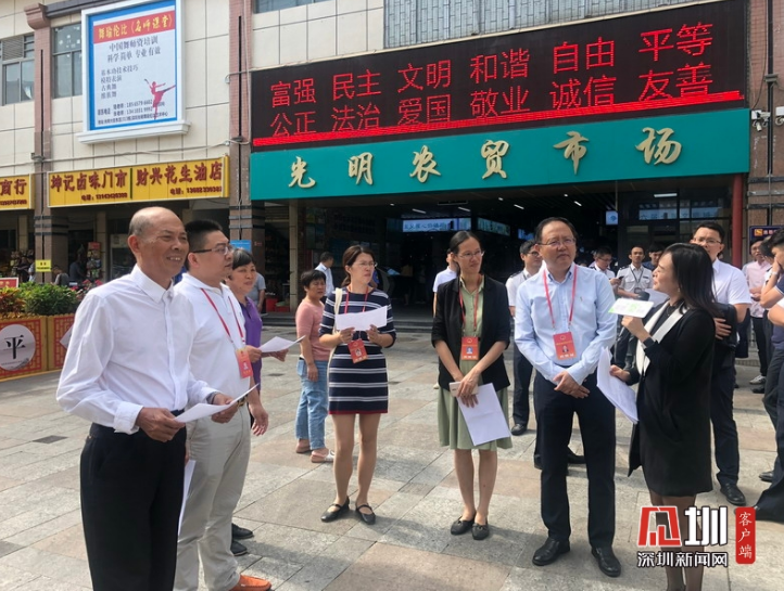 现场,街坊代表团跟着深圳市市场监督管理局、光明农贸市场负责人“察”市场。首先是察看了智慧计量、供排水、供电、通风、环卫、消防、检测、经营、监控、信息化、服务等设施设备;其次,还对商品准入、商品陈列、包装等商品管理及食品安全管理相关制度进行监督;同时街坊代表团还察看了光明农贸市场的环境卫生、安全生产、市场周边、经营秩序等管理的情况。