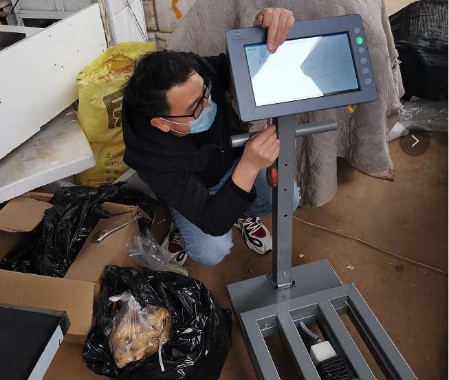 疫情期间,食材需求激增,要保障食材供应工作高效有序进行,智能分拣秤必不可少。小伙伴戴好口罩为客户调试电子秤。