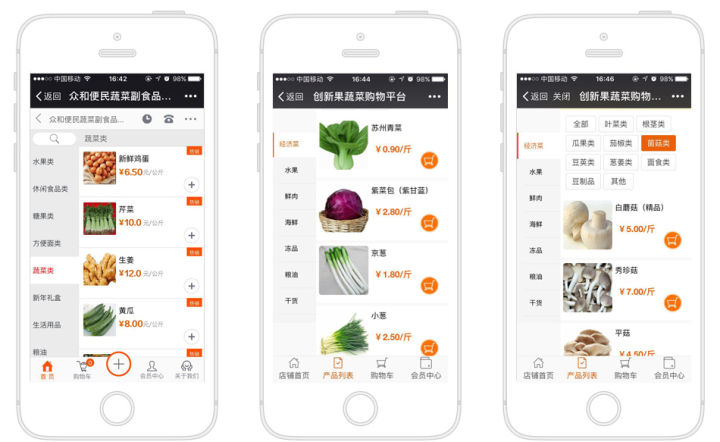 1、在线微信买菜:蔬菜多分类、多图多彩,下单功能简单明了,界面有多种风格模板!