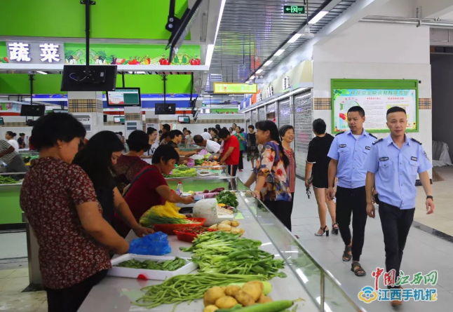 中国江西网/上饶头条客户端讯 通讯员张和清报道:微信、支付宝扫码支付,摊主在电子称上称食品时,食品数量、金额可清楚地显示在摊位上方的电子显示屏上……8月13日早晨6点30分,笔者来到玉山县武安西路新建的开始试运营的农贸市场——玉山凤凰智慧农贸市场,只见乳白色的地面砖洁净无瑕,摊位上的各种蔬菜陈列整齐。