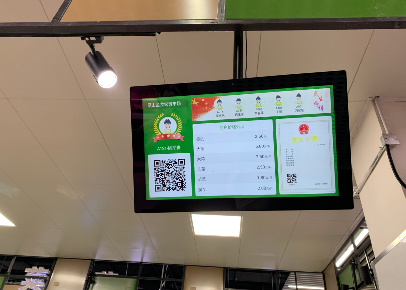 比如,商户信息显示屏。上面菜品明码标价,消费者不用像以前一样一个一个摊位问菜价,像逛超市一样,一目了然。显示屏还有专门区域发布党建宣传内容,还在商户中评选出党员示范商户,让党的形象深入基层群众。