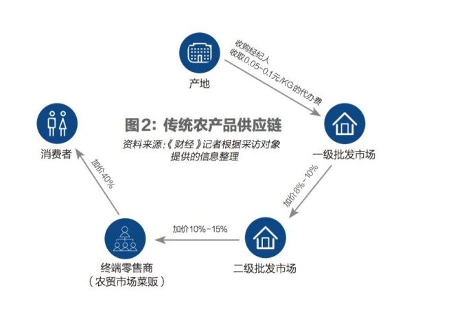 一位生鲜业内人士给《财经》记者算了一笔账。农产品从产地进入物流体系,通过收购人到达一级批发市场,会产生一笔代办费,通常为一斤0.1元或者5分钱,一级批发市场加价8%到10%,流通到北京新发地这样的二级批发市场,终端零售商再付出多10%到15%的代价从二级批发市场拿货,最终加价40%卖给消费者。
