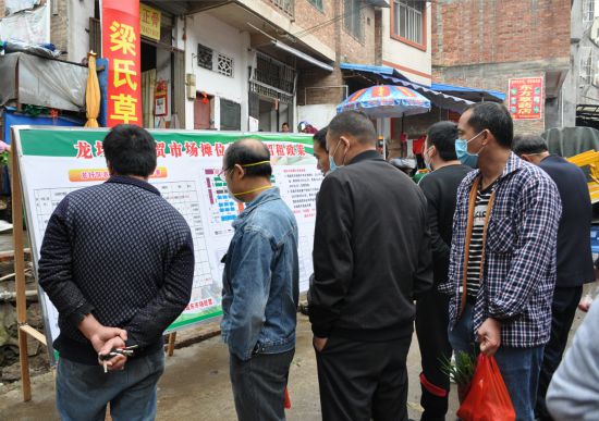 在河岸市场入口看到,许多群众正在看龙圩区农贸市场摊位分布及招租政策展板。据悉,结合“四城联创”的工作要求,以及下廓街棚户区改造项目的需要,河堤棚架市场门口路段现在正在进行排水系统等建设,龙圩区也将于近期对防洪堤河岸市场进行拆除及部分路段封闭施工,周边流动摊贩业主必须于3月30日前自行清理占道物品、搭盖物。