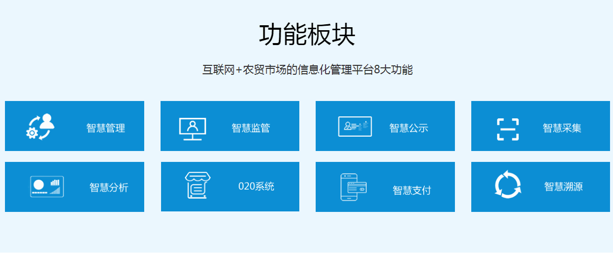 针对智慧农贸市场的管理现状,管理软件在操作上应该简易化,管理信息化、流程化,计划目标明确化,数据分析智能化,同时结合智慧农贸市场,应该具备智慧管理、智慧监管、智慧公示、智慧采集、智慧分析、O2O系统、智慧支付、智慧溯源等功能。将市场管理和互联网相融合,全面满足农贸市场的运营管理。