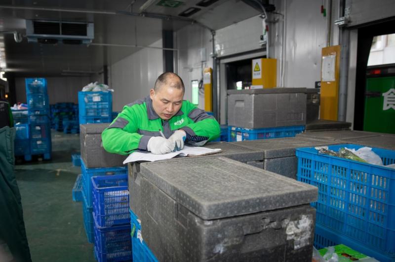 4时30分,送货员孙昌健起床了,半小时后,老孙来到物流配送中心。之前,打包好的一份份订单已经被放在预冷库暂存。老孙需要做的事情是根据自己的线路,去冷库找对应的货物。搬菜上车前,每个包裹老孙都会再检查一遍。破损的不要,漏水的不要,看起来不新鲜的也不要,特别是快过年了,订单多,一旦发现品相不过关,老孙就会及时与配单生产线上留守的工作人员沟通,重新来配。