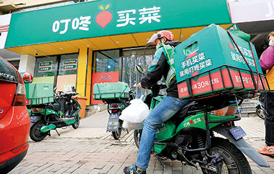 ▲外送员骑电动车从“叮咚买菜”上海浦东云山路前置仓出发送货(4月17日摄)。
