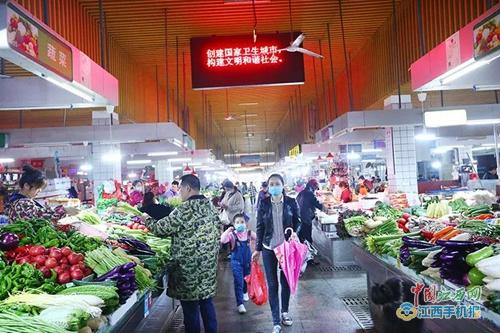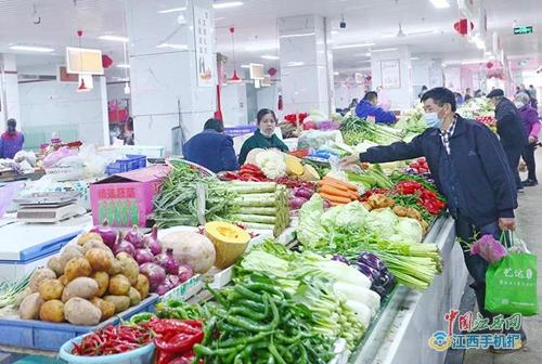 走进临江农贸市场,入口处竖立着疫情防控的温馨提醒和文明礼仪的公益广告,买菜的市民佩戴好口罩,按照农贸市场的提醒,出示“赣通码”并配合工作人员进行测量体温正常后,依次走进干净明亮的市场。