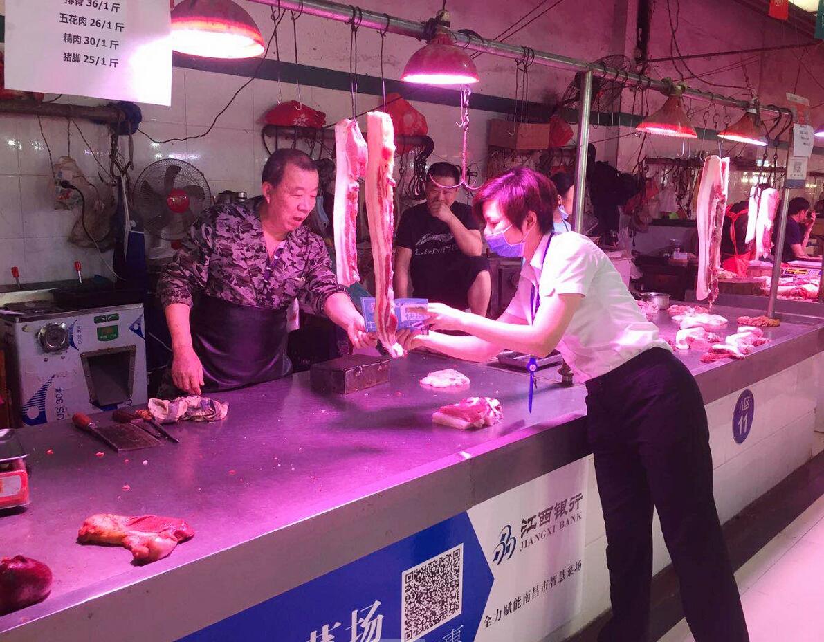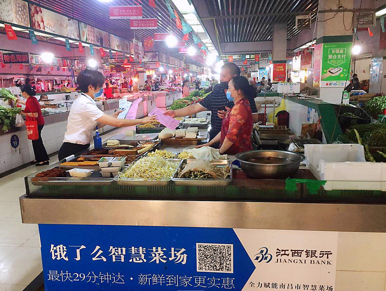 5月初,江西银行与阿里巴巴旗下本地服务商签订南昌市智慧菜场合作协议。作为该服务商的唯一金融结算机构,5月11日,江西银行总行营业部派工作人员进驻试点菜场,在农贸市场提供的广告宣传位上摆放宣传资料,开展刷江西银行卡立减优惠,并现场开卡,营销信用卡、储蓄等宣传活动。