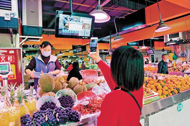 大渡口区半岛逸景农贸市场,市民通过手机扫码支付。(市市场监管局提供图)