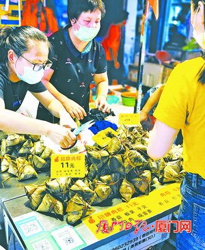 肉粽、碱粽、花生粽、豆沙粽、红枣粽、鲍鱼粽……不同口味的粽子吸引着来来往往的市民。“碱粽我拿10个,花生粽、红豆粽和肉粽各来6个。”一个粽子摊位前,市民李女士一口气买下28个粽子。