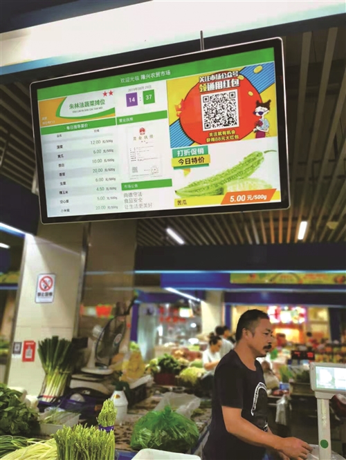 通过智慧市场建设,隆兴农贸市场每个摊位都配置了电子显示屏、电子打码秤、POS机,进行了线路改造,安装“智慧农贸市场管理系统”,通过视频监控联网、线上线下融合交易和移动支付,实现智慧支付、智慧经营、智慧监管。