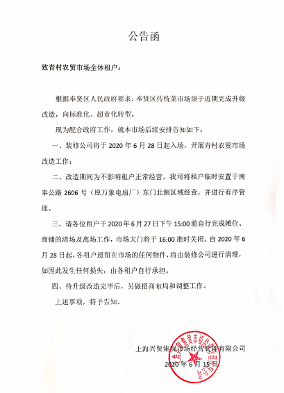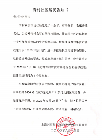 通过本次改造,将全面规范青村农贸市场经营秩序,重点对青村农贸市场内部进行整改,严厉打击无证照经营、制假售假和乱拉电线等行为,清除农贸市场内外布局不合理、环境“脏乱差”现象,达到“干净、整洁、平安、有序”的要求。