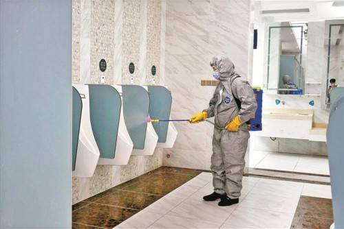 保洁人员对福田区福中三路公厕进行冲洗消毒。