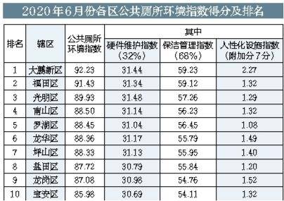 昨日,市城管和综合执法局同步发布公厕环境指数测评成绩。6月份深圳市公共厕所环境指数总得分为88.54分,环比下降0.62分,基本保持平稳。其中,硬件维护得分为31.09分(满分32分),保洁管理得分为56.27分(满分68分)。排名方面,大鹏、福田、光明分列各区排名前三,口岸、地铁、市政公厕分列各行业排名前三。