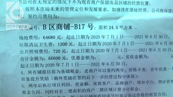 这份由商户提供的收费通知中写明:面积为24.5平米的商铺,场地费用是64680元一年。此外还有卫生、照明等费用,总计为66600元。商户们说,商铺的租金根据位置和大小每家都不一样,但是相比之前几乎都上涨了好几倍。