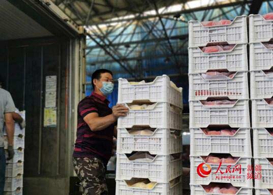 7月28日,在新疆九鼎农产品批发交易市场(以下简称“九鼎市场”),乌鲁木齐果真如此贸易有限公司集散中心的10余名配送员正对照印有姓名、地址、电话、货物明细的订单有序配货。